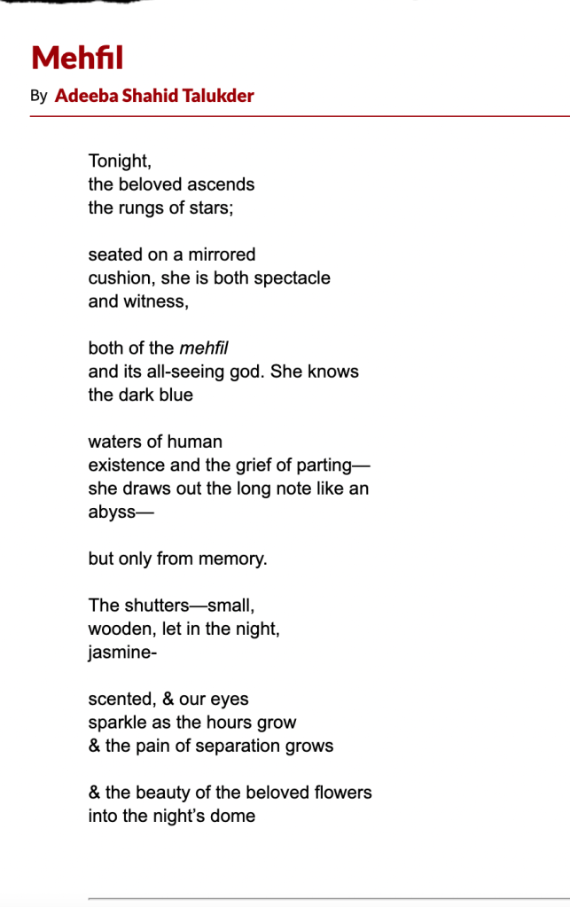 Honored to say that “Mehfil” Is Poem of the Week at Split This Rock! As someone who is just beginning to perform, I think often about Farida Khanum and Iqbal Bano–their grace, their ease as they move between notes. I also think about the singer must remove herself from the concept of the ghazal beloved in order to sing about her, but also how the figures intertwine in my imagination.