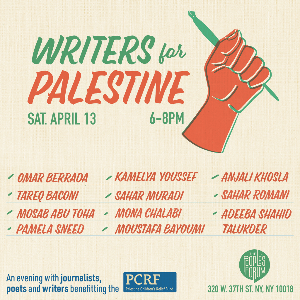 Posted on April 12, 2024April 12, 2024 Writers For Palestine I’ll be reading for Palestine tomorrow at The People’s Forum with the most brilliant writers and activists. Please join us! Share this: Click to share on X (Opens in new window) X Click to share on Facebook (Opens in new window) Facebook Like Loading... Related