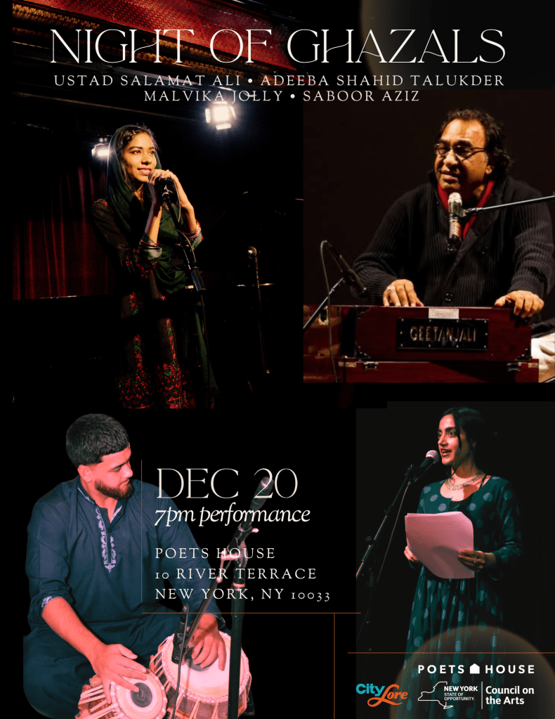 December 20th will mark my debut as a ghazal singer. So, so honored to be sharing the stage with Ustad Salamat Ali, Saboor Aziz, and Malvika Jolly. Here is the link to RSVP, and the full event description is below: